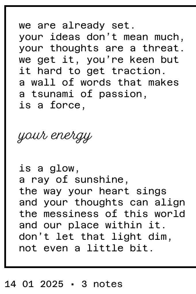 to read this poem, start in the middle with ‘your energy’ and read up, line by line. then, return to the middle again and read down.